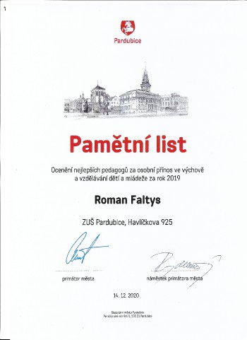 Vzhledem k dlouholetým mimořádným úspěchům trumpetistů z naší Žesťové harmonie Pardubice, kterých si všímá i vedení našeho města, byl v pátek 18.12. na pardubické radnici už po třetí!!! oceněn náš pan učitel Roman Faltys. Blahopřejeme a těšíme se na další krásná vystoupení, akce a soutěže!